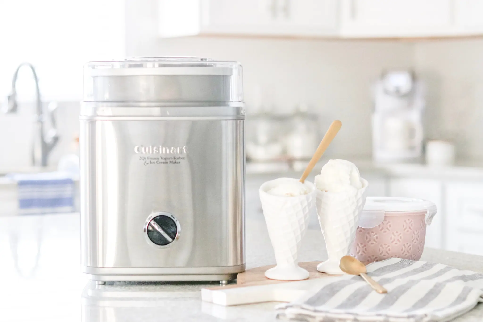 What’s better than one quart of luscious homemade ice cream, sorbet, or frozen yogurt? Two quarts! The fully automatic Cuisinart® Pure Indulgenceâ„¢ makes 2 quarts of your favorite frozen desserts or drinks in as little as 25 minutes. It’s easy – an integrated motor, double-insulated freezer bowl and automatic mixing paddle do all the work. Results are consistently smooth, cleanup is easy, and the brushed metal styling is simply sensational.