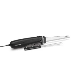 The knife set includes a carving/serving fork and a bamboo cutting board. The power handle, blade and fork fit into their own tray when not in use, and the cutting board slips underneath to store. Convenient, start to finish! The ultra-sharp blade on the Cuisinart® Electric Knife carves meats and poultry as quickly and smoothly as it slices bread. The ergonomic handle is comfortable, even with extended use, letting users cut uniformly consistent slices, one after another. A simple trigger on/off switch turns the knife off the instant the trigger is released.