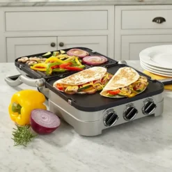 With five separate cooking options, the Cuisinart® Griddler® can handle everything from pancakes and sausages to grilled cheese to steaks, hamburgers, and panini. A floating cover and one set of reversible plates turn the Griddler® into a contact grill, panini press, full grill, full griddle, or half grill/half griddle. Dual temperature controls ensure everything is perfectly cooked every time on the removable dishwasher safe nonstick cooking plates for easy meals and clean up.
