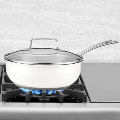 This 3 Qt. Chef’s Pan features an impact bonded aluminum encapsulated base for fast and even heating. Stainless steel cooking surface does not become discolored, react with foods, or alter flavors. Tempered glass lid fits tight to lock in flavor, texture and nutrients. Dishwasher safe so cleanup is conveniently hassle free. A beautiful white matte exterior to brighten up your kitchen and complement any kitchen décor.