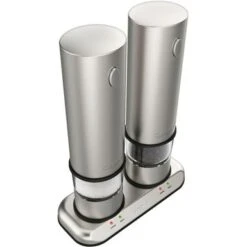 Details These rechargeable Salt & Pepper Mills from Cuisinart are an easy and elegant way to serve freshly ground salt and pepper. Mills sit in a sleek power base and are always fully charged. LED lights up for when they are charging and when ready. Mills adjust for fine to course grinds Charge and ready indicator lights illuminate when in the charger Clear spice-holder containers make it easy to check salt and pepper levels at a glance Brushed stainless steel with embossed Cuisinart logo Includes: Salt mill (spice sold separately) Pepper mill (spice sold separately) Rechargeable cordless holder Set measures 1.23″ L x 2.61″ W x 3.94″ H Requires 4 AA rechargeable batteries (included) 3-year limited manufacturer’s warranty.
